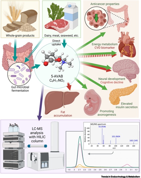 Haikonen, R., Kärkkäinen, O., Koistinen, V. M., Hanhineva, K. (2022). Diet- and microbiota-related metabolite, 5-aminovaleric acid betaine (5-AVAB), in health and disease. Trends in Endocrinology & Metabolism, 33(7), 463-480. Open-access paper.